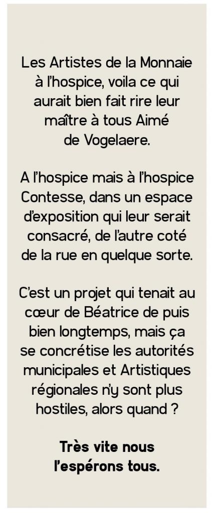 J’adore ses mélanges subtils d’émaux , une science qu l’on acquiert après un long apprentissage. Mais je suis peut être influencé par cette après-midi de 1967, où j’accompagnais deux amies qui lui portaient une lettre, dans sa cave au 61 de la rue de la Monnaie. Aujourd’hui, au fond de la cour de l’Hôtel de la Monnaie, le restaurant l’Assiette du Marché, l’une des meilleures tables de Lille occupe l’espace.