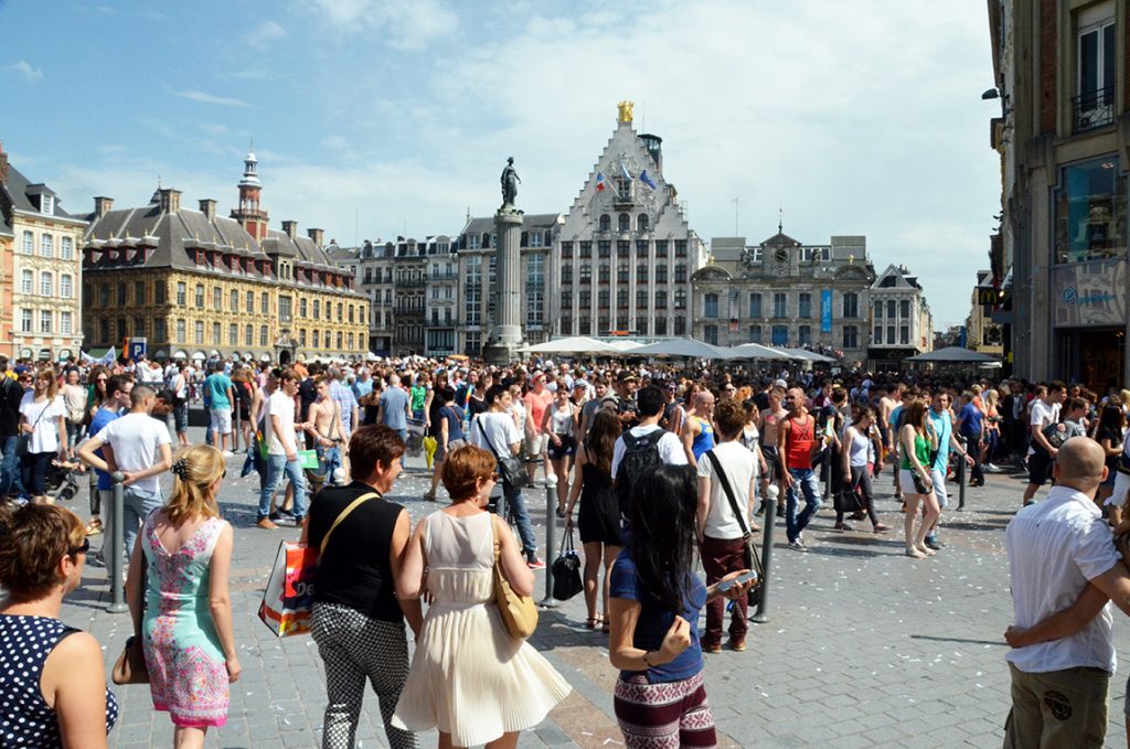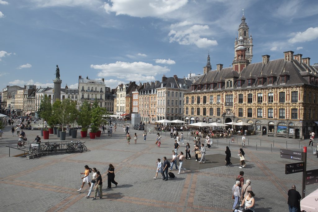 Les maisons de l’époque sont en bois avec un toit de chaume. Au XVIe siècle, le Magistrat, soucieux d’éviter les incendies, impose de nouvelles normes de construction. Désormais, les maisons doivent adopter la brique, le grès ou la pierre. Progressivement, elles vont remplacer les anciennes. Ce n’est pourtant qu’au XVIIe siècle que la place va adopter une configuration proche de celle d’aujourd’hui. Au début des années 1650, les Echevins lillois obtiennent l’autorisation d’édifier une bourse de commerce. Le nouveau bâtiment est construit au beau milieu de la place du marché et va la couper en deux. D’un côté, la petite place (où se trouve l’actuel opéra), de l’autre… la grande place ! C’est de là que vient son nom, « Grand-Place » qu’elle va garder jusqu’à nos jours. Le plan du nouvel édifice est confié à Julien Destré. Les travaux seront réalisés rapidement, de 1652 à 1653. Pourtant, il s’agit d’un bâtiment remarquable qui va changer la physionomie du centre-ville et contribuer pour des siècles à l’identité de la capitale des Flandres. Cette bourse est un lieu d’échanges et de commerce, mais c’est aussi un programme immobilier. Elle est formée de 24 copropriétés mitoyennes. C’est l’ancêtre de nos galeries marchandes d’aujourd’hui. Pour la ville, c’est surtout une opération immobilière, apte à améliorer ses finances. Grâce à des rénovations successives, ce bâtiment n’a guère changé aujourd’hui. La place est un lieu touristique plébiscité par de nombreux visiteurs étrangers. En 1792, l’église Saint-Étienne, l’un des fleurons de ce lieu historique est ruinée par le bombardement des Autrichiens qui font le siège de la ville. Elle ne sera jamais reconstruite.