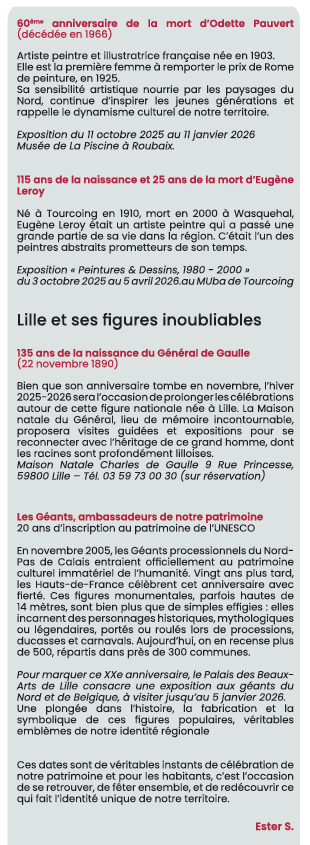 Entre deux parutions de La Gazette de Lille Magazine, découvrez notre coup de projecteur sur les anniversaires et commémorations qui rythmeront les Hauts-de-France de fin 2025 au premier